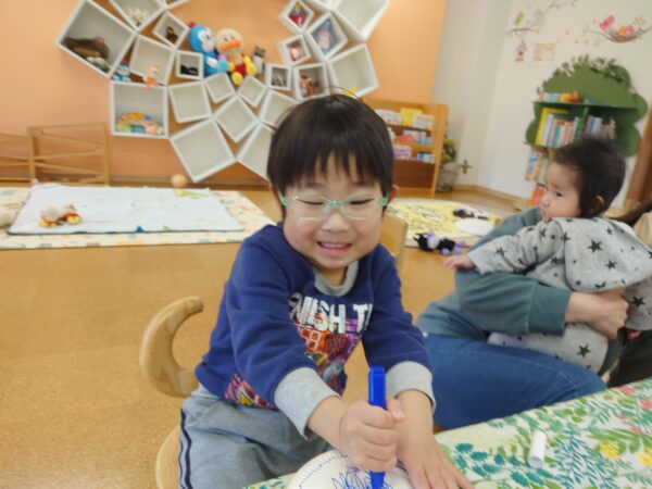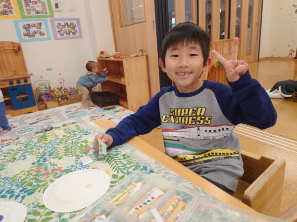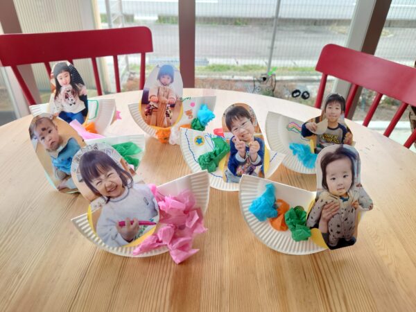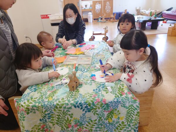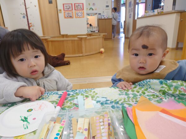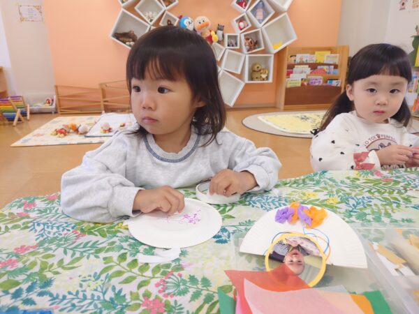 シール貼りやお絵かき、花紙で
