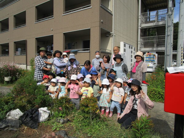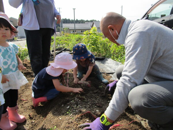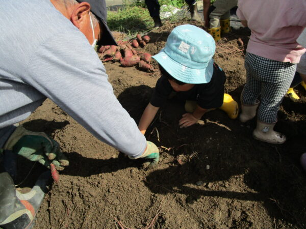 地域の方にサツマイモ掘りのお誘いを頂き、みんなで参加して来ました。 ちょっぴりドキドキの子ども達でしたが、地域の方々と力を合わせてさつまいも掘り開始!! 掘り始めると「あったぁ~」とたくさんの声が聞こえてきました。 帰りには収穫したお芋のお土産を頂きました!!