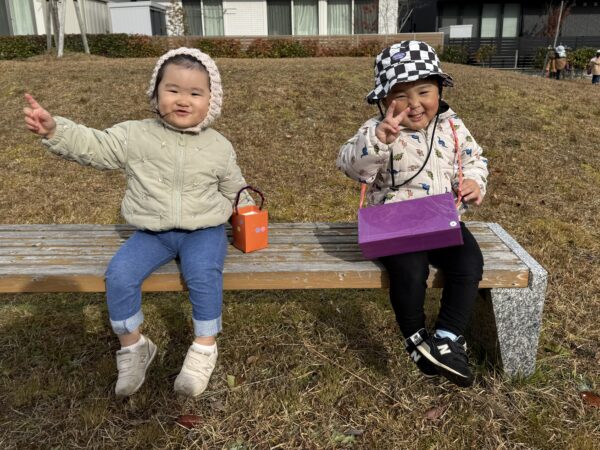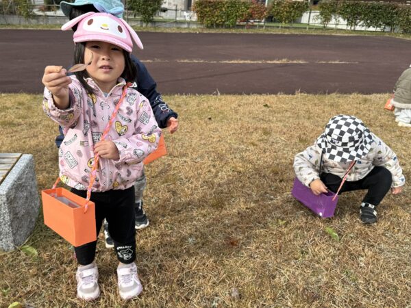 手作りの探索バックを持って公園へお散歩に行きました! 秋の風を感じながら歩き、色とりどりの葉っぱを見つけると「きれいだね」と嬉しそうに拾っては、バックに入れていました。 秋ならではの発見を楽しみました♪