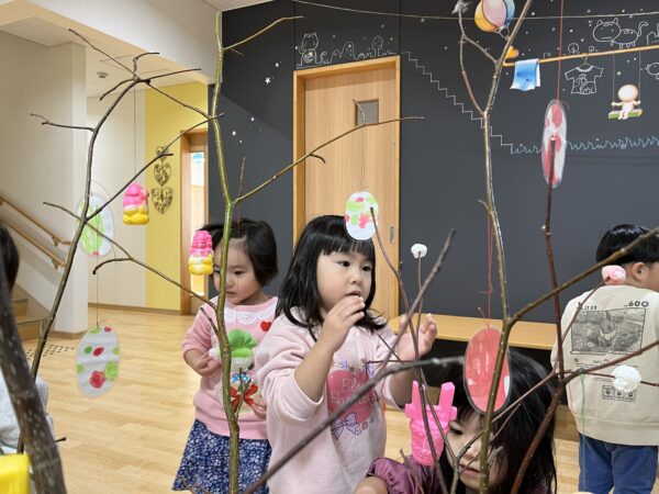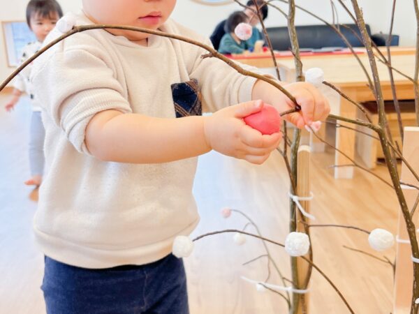 りす組のお友だちは紙粘土を使って団子を作り、みずきの木にさしました。
