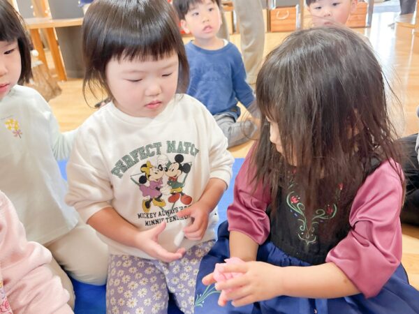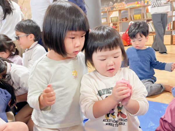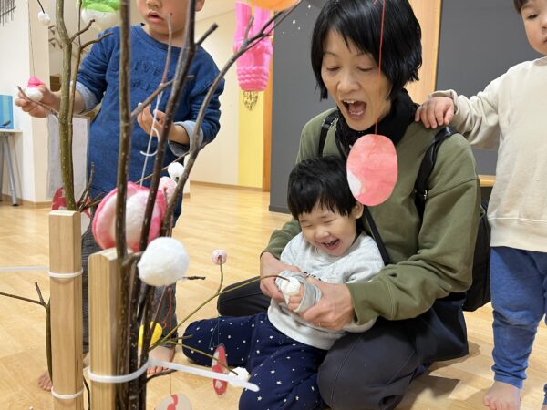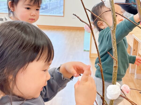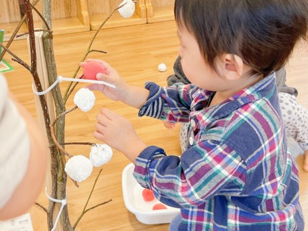 今日は小正月です。 だんごさしの飾りを見ながら「みんなが元気でいられますように」「たくさんご飯が食べられますように」と、願う日ということを伝えながら、まゆみぷらすのお友だちと一緒にだんごさしの行事をしました。粉に水を入れ、こねると団子になる過程を見たり、丸めたりしながらみずきの木にさしてきました。