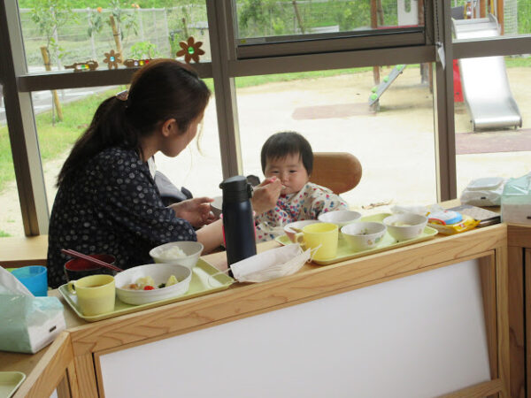 今日は、みんなの昼食会(親子昼食会)。 今日のメニューは ☆ごはん ☆とりの生姜風味焼き ☆のり塩ポテト ☆ブロッコリーとトマトのサラダ ☆味噌汁 みんな、『おいしいね』と言いながら 給食をパクパク食べていました。 お弁当を持ってきていたおともだちも 一緒にランチタイム! みんなで食べるとおいしいね。