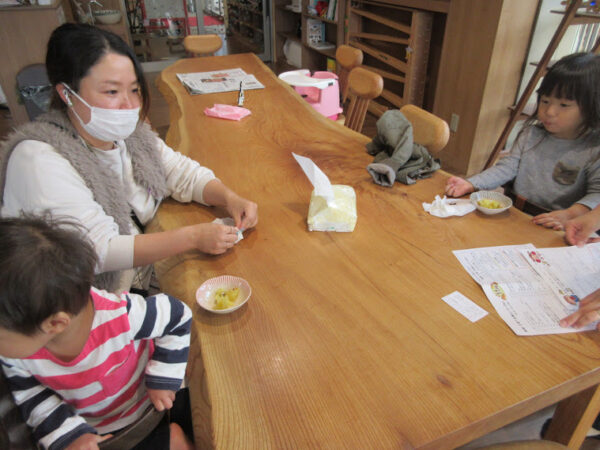 センターでわかめご飯を準備して、芋煮汁と一緒に