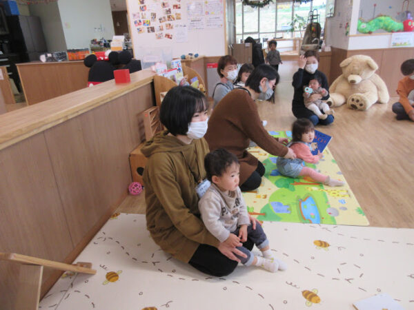 今日から12月。今日はなかなか気温が上がらず、 寒い一日でしたが、こどもたちは元気いっぱい。 園庭で外遊びを楽しんでいるおともだちも。 今日は10時から、絵本の読み聞かせとリズム遊び。 ママのお膝の上に座って親子で絵本を楽しんでいる姿。 とっても素敵です。 リズム遊びでは、幼児部のおともだちも一緒に! お兄さん、お姉さんが一緒で、おともだちもとてもうれしそうです。
