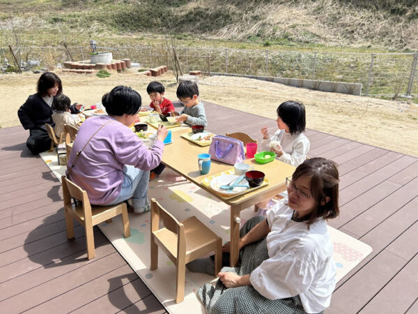 今日のプチカフェランチ・気まぐれこども食堂は ☆鶏肉のトマトクリーム煮ごはん トマトの酸味が、豆乳でまろやかに・・・。 ポカポカの暖かい陽気に誘われて テラスでランチタイムです。