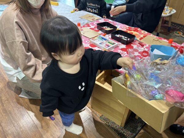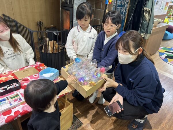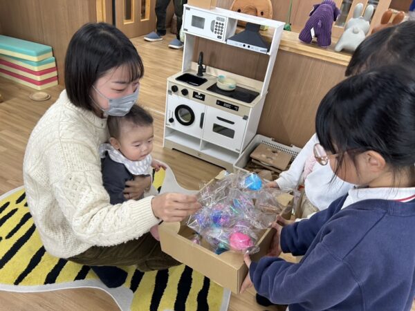 こども園の年長さんのおともだちが センターに遊びに来ていた、小さいおともだちに、 手つくりの『あめ』のプレゼント。 色とりどりの『あめ』にこどもたちは大喜び! 年長さんありがとう!