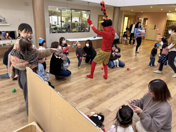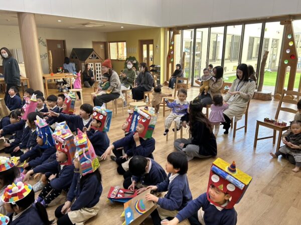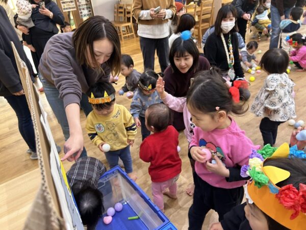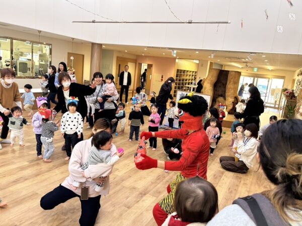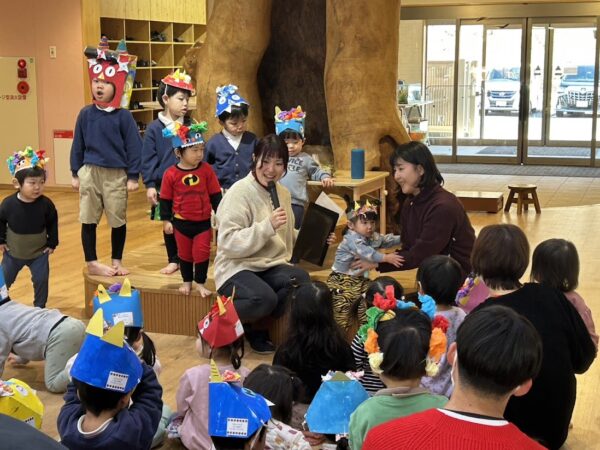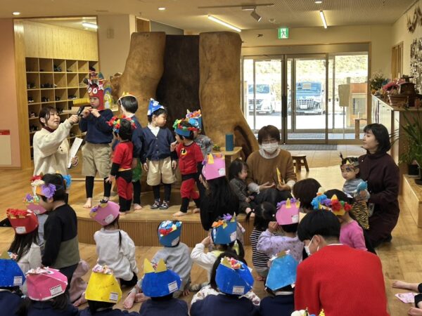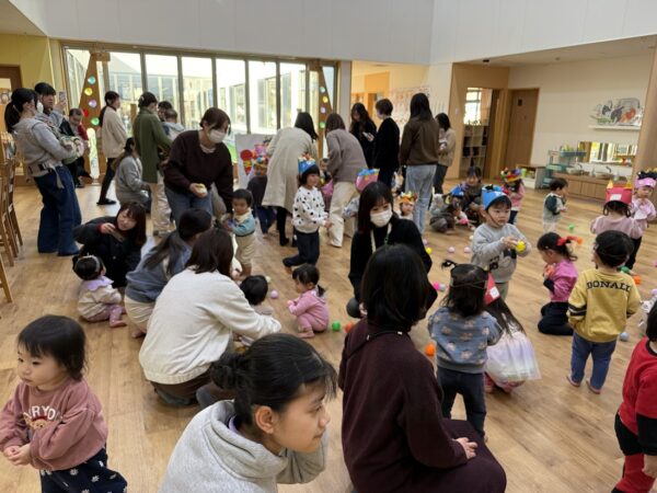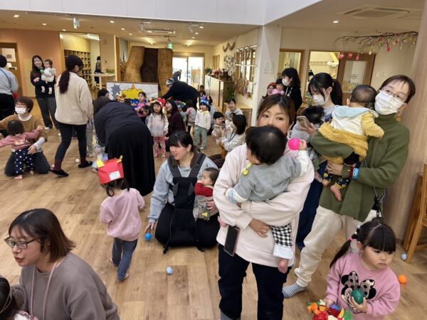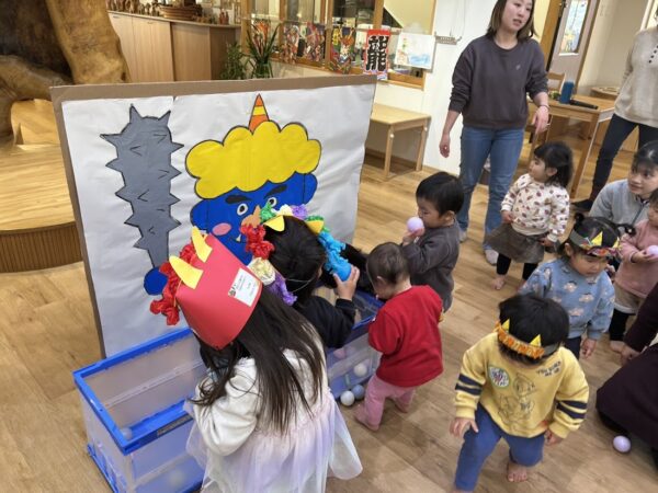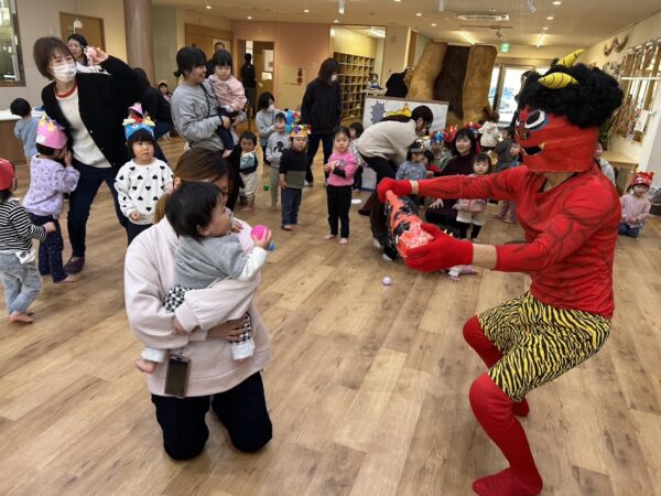 今日は節分。こども園の節分の行事 ✩豆まき会☆に Denのおともだちも参加。 25組の方が参加してくれました。 こども園のおともだちと一緒に、 節分のお話を聞いたり、制作の発表をしました。 そのあと、乳児部のおともだちと一緒に、 かわいい『あかおに』と『あおおに』を 退治! 最後はみんなで記念写真です! みんなの悪い鬼は退治できたかな?