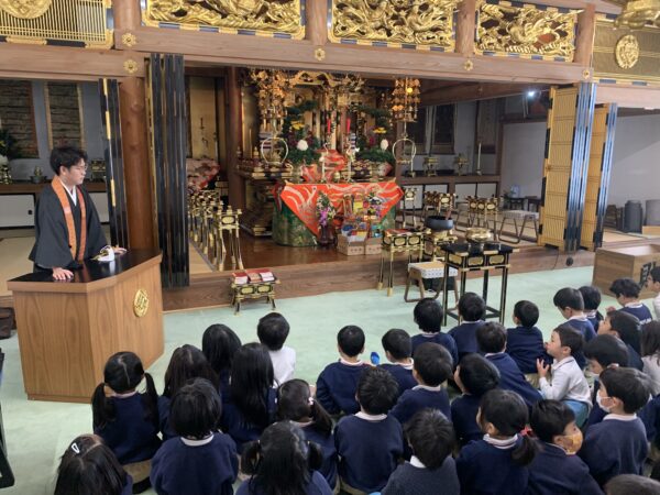 七五三のお祝いを行いました。 幼児部の子ども達は、本堂の中に入り七五三の由来を聞いたり、お経を聞いたりしながらお参りを行いました。 最後まで正座をして上手に話を聞く子ども達でした。 乳児部の子ども達も、自分たちで作った千歳飴の袋を持って写真撮影を行いました!