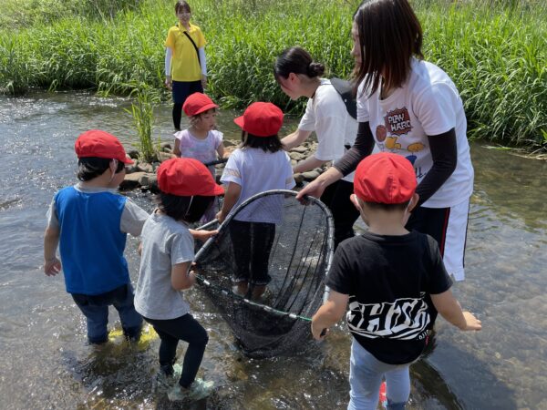 今日は年中児13名で近くの川に行き、雑魚すくいを行いました。冷たい川の水に驚きながらも、大きな網をガサゴソとゆすって川の生き物を沢山見つけました!! 魚に、エビに、様々な種類のやご、、、園に戻ってからは水槽と図鑑を見比べたり、園の残っていた友達に報告したりと、貴重な経験になりました。