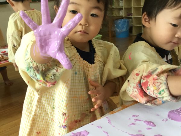 今日は8月の誕生児紹介を行いました。名前を呼ばれると照れながらも元気に返事をする誕生児たち。みんなにお祝いしてもらい、嬉しそうでした! うさぎ組ではフィンガーペイントをして遊びました。手のひら全体で絵の具の感触を楽しみ、紙に手形を押したり、指で点々と模様をつけたり、思い切り楽しむことができました。