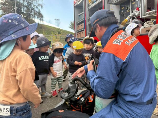 先日、火災を想定した総合防災訓練を実施しました。先生の呼びかけに落ち着いて避難出来ました。避難後は、消防車の見学をさせていただきました。命を守る大切な仕事について知る貴重な機会となりました。また、先生たちの消火訓練も行いました。子どもたちから「がんばれ!」と大きな声援が送られました。 今後も定期的な訓練を行い園児の安全を第一に防災意識を高めてまいります。
