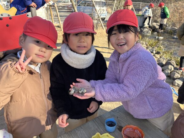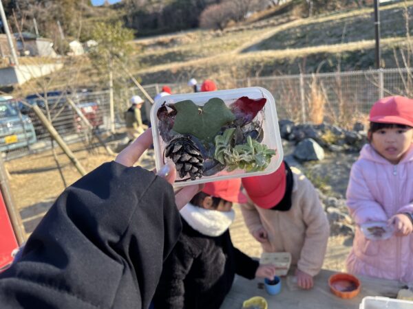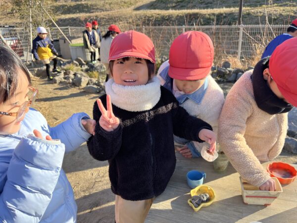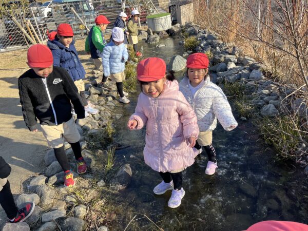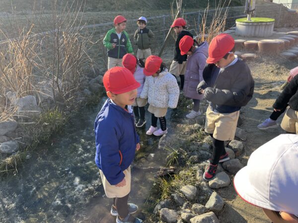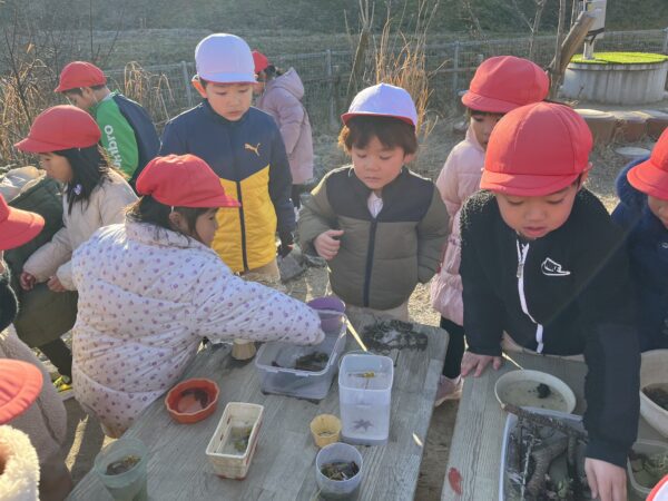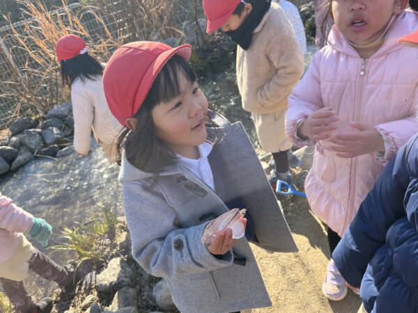 毎日園庭のビオトープに氷が張っているかを確認するのが日課となっています! 今日は今まで以上に分厚い氷が張っていたことで、ビオトープの上を歩くことが出来ました!! 「すごいね!!」「みんなで乗っても割れないね!」と、ビオトープの上を滑って楽しむ子どもたちでした。 また、葉っぱや枝を入れた容器に水を注ぎ、自分たちで氷作りも楽しみ、綺麗な氷が出来上がると目をキラキラと輝かせて喜んでいました☆ 今後も冬ならではの自然に親しみながら楽しんでいきます!