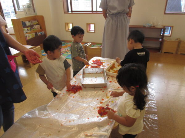 雨、雨、雨ですが、戸外・室内遊びでは、夏を感じる遊びを展開しています。 幼児部は、虫探しが人気です。乳児部は、感触遊びに夢中です。 まだまだ暑い日が続きますが、夏ならではの遊びを展開していきます。 年長児は、自分たちが出かけた水族館を形にするのに取り組んでいます。 アクアマリン「まゆみぷらす」は8月10日にオープン予定です。今からたのしみです。