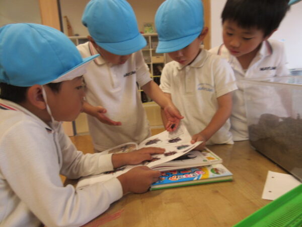 年長児が観察ケースを持って来て「先生、カブトムシみつけたよ」とみせてくれました。 様子を見守ると何やら図鑑探して調べ出しました。するとなんだか衝撃的なできた事が判明したようで耳を傾けると カブトムシだと思っていた虫が「こがねむし」だったことがわかったようです。思わずくすっと笑ってしまいました。