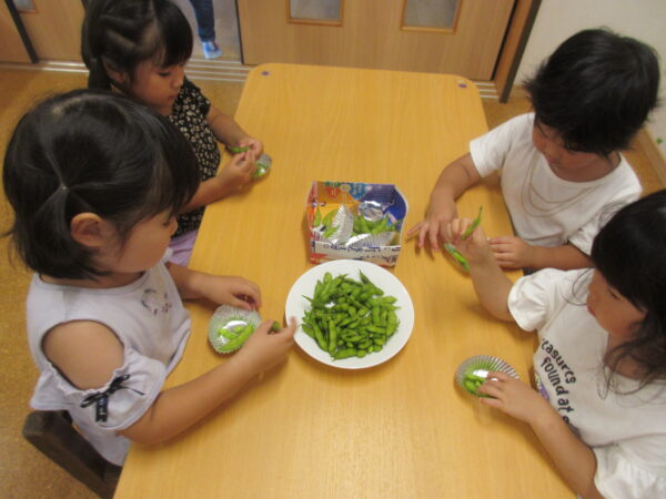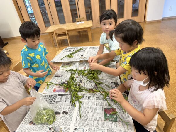 園にお土産に頂いたえだまめは、まゆみぷらすでお留守番をしてくれていた年少・年長児も頂きました。