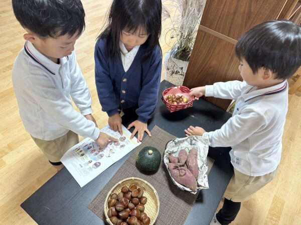 いつのまにか、ドーナツテーブルにくりが可愛くならんでいました。まるで、トトロが遊びにきたかのようです。 どんぐりは、くりの赤ちゃん? どんぐりが大きくなるとくりになるのかな? そんな可愛い会話も聞かれます。 年長児は、さすがです! 図鑑でどんぐりの名前を調べたり、園庭のどんぐりの木の葉の色を観察して、種類の違いに気付いたり。発見はまだまだ続きそうです。