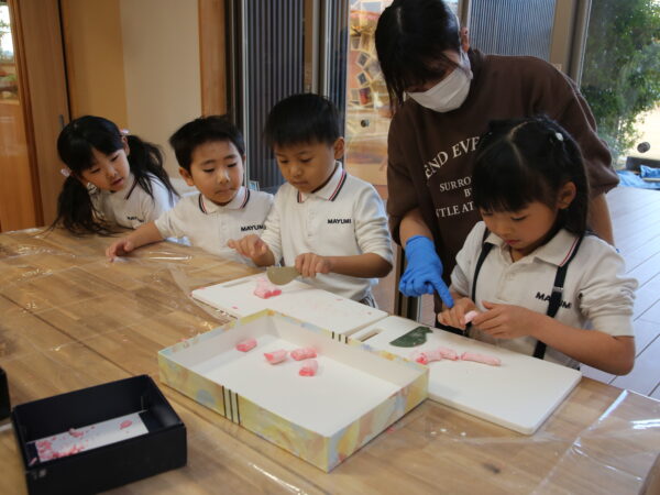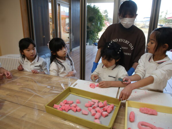 年長児にとって最後の「だんごさし」 今までの経験をいかし、自分たちでだんごづくりに挑戦!!初めての試みで保育者はドキドキ・ワクワク。 子どもたち一人一人が役割をもって行動する姿に成長を感じました。 だんごを作るだけじゃなく、いろんな仕事をみつけて行動し友達と協力して出来ました。