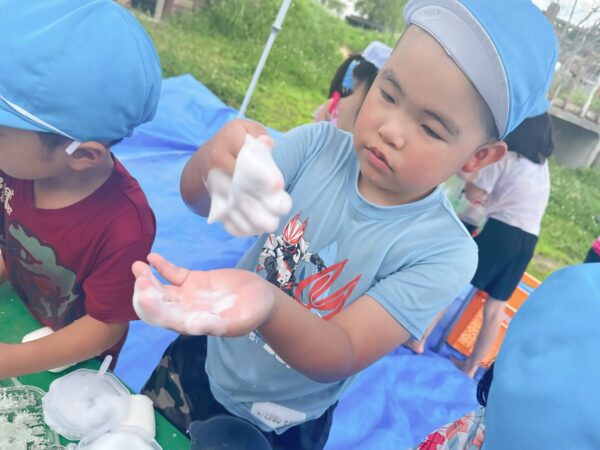 暑い日が続いていますね。 幼児部の子どもたちは、大きなじゃぶじゃぶ池に大はしゃぎ!! その側では、色水の実験遊びが発展して、なんともおいしそうなジュースやソフトクリームがたくさんできています。 乳児部の子どもたちは、テラスでまったり、水にたわむれたり、洗濯ごっこを楽しんだり。 みんな、いい笑顔です。