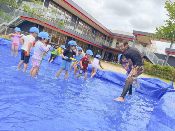 2学期になり、みんなで水遊びが出来る日も限られてくるので年中児と年少児がじゃぶじゃぶ池に挑戦!! 「すごーい、ひろーい、たのしーい」「水が冷たいけど気持ち」と楽しみました。 明日も、年長児と年少児が挑戦します。天気に恵まれるといいなぁ