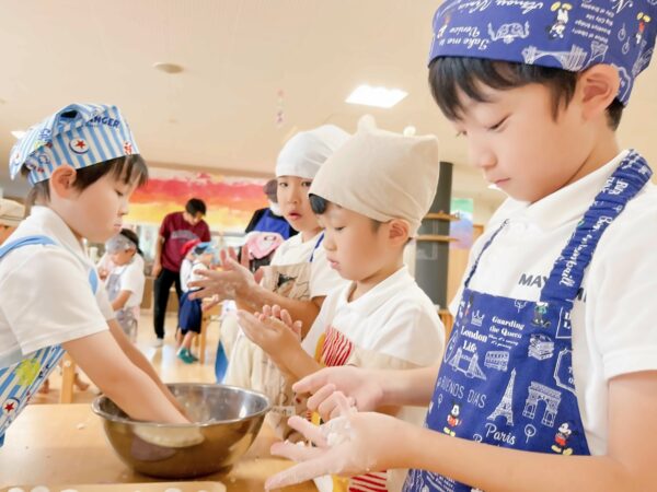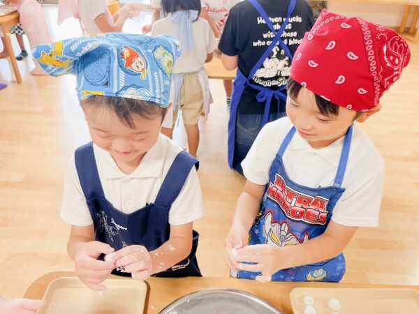 今日は、年長児が「だんごづくり」に挑戦!! 先週からいろいろ考えていたので、みんなで協力して作る事ができました。 お泊り保育でのうどん作りの経験が活かされ、「水は少しずつ入れよう」「やわらかさは、耳たぶぐらい」など 友達と相談しながらおいしいお月見団子を作ってくれました。