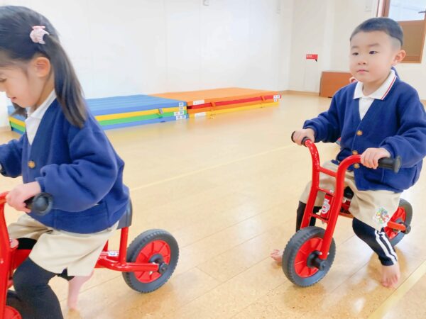 年少児が遊戯室でバイクに挑戦していました。 順番大丈夫かな?トラブルにならないかな?と心配しながら見守ると 「かして」「いいよ」「3回したらね」「ちょっと待ってってね」 友達同士かかわりながらルールを守って遊ぶことができました。