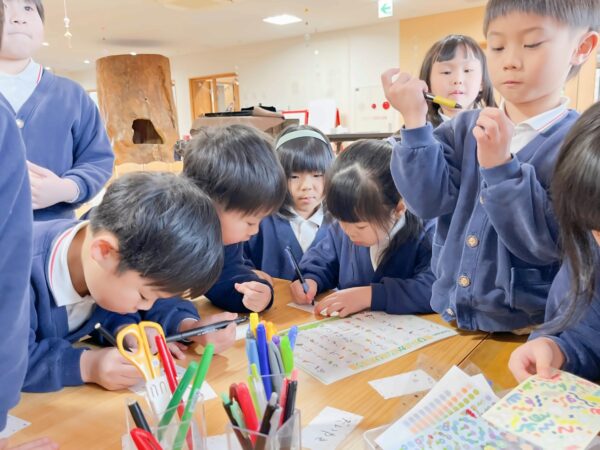年長児にとっては最後のお弁当の日 子どもたちは、食べ終わると何かをしています。「喜んでくれるかな」 「気持ちが伝わるかな」ドキドキしながら一生懸命書いていました。 保護者の皆さんの反応が見れないのがとても残念です。