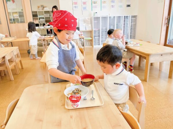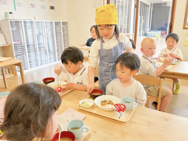 「きょうの給食、なんだろ?」と、給食室をのぞき込む子どもたち。 年少児も、年長児のお手伝いをもらいながら、少しずつ昼食時の流れをつかんできました。 来週からは、年少児もランチルームで給食です。 年長児のみんな、サポートよろしくね!