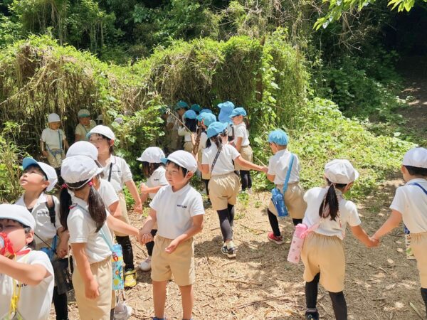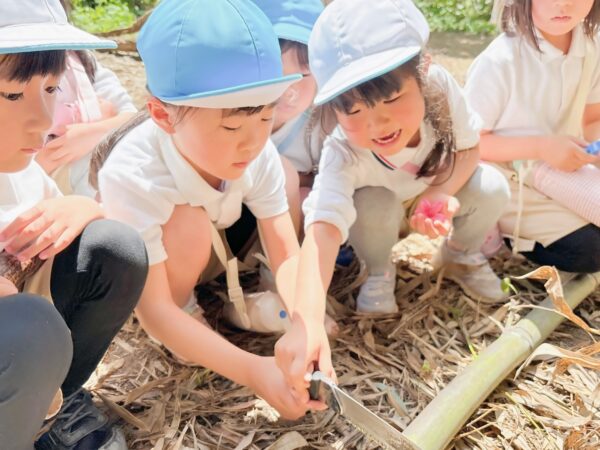 年長児はみんなでまゆみの森へ! 竹のトンネルを抜けた先の広場で、竹を切ってみたり、生き物を探したり。 以前いった時よりも緑豊かになった森に 「なんだか暗いね~」 「ドキドキするね~」 と会話をしながら進んでいきます。 森の中で色々な発見した子ども達は、園に戻ってきてから見つけたものを伝える姿が見られていました。