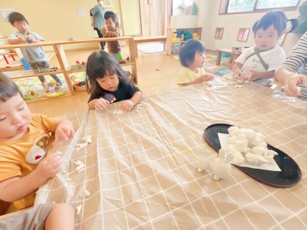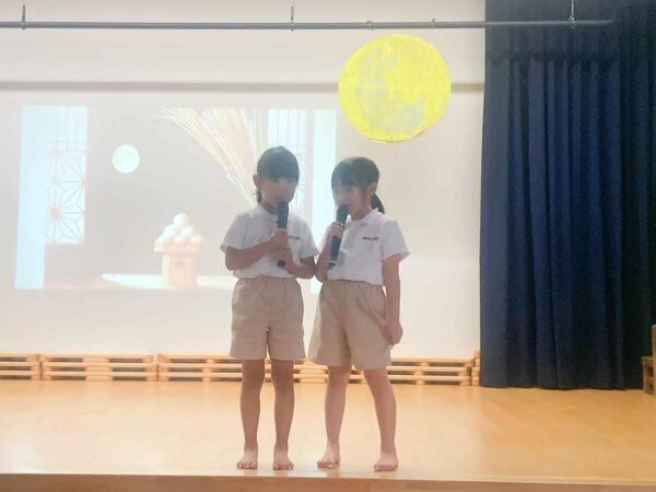 今日は十五夜。 園でもお月見会が行われました。 秋の実りを祝う十五夜、 年長児からは園庭の秋の実りの紹介やお月見の由来についての発表がありました。 乳児部の子ども達はお月見団子作りも楽しみました。