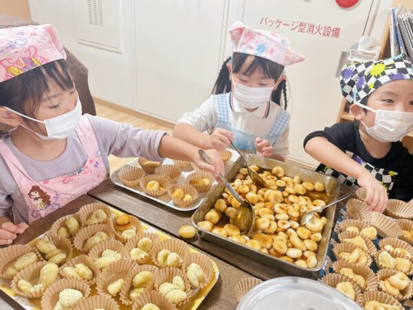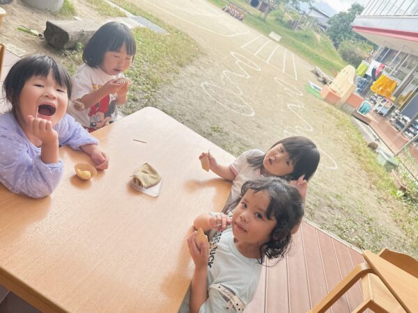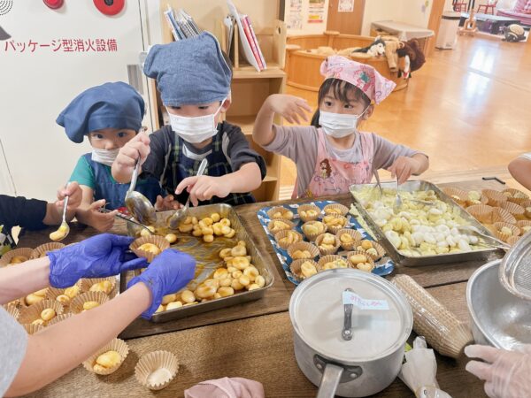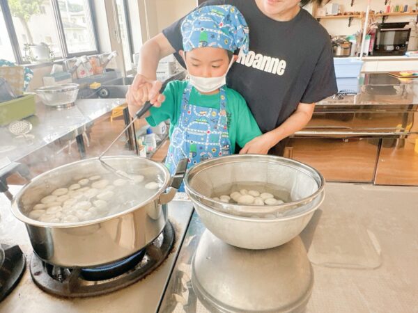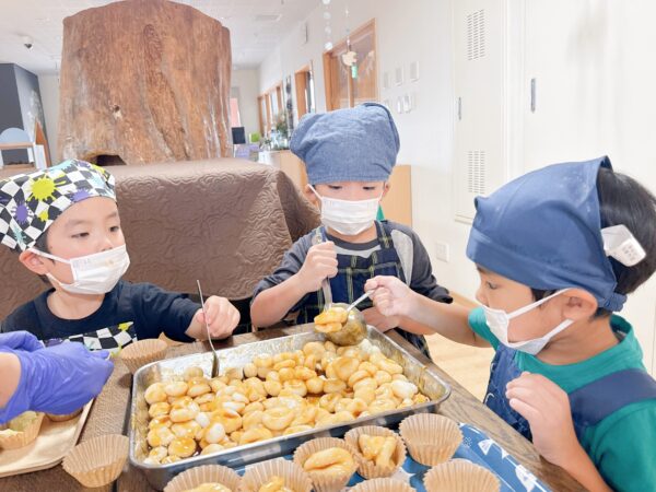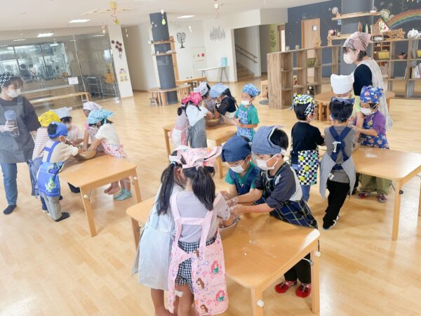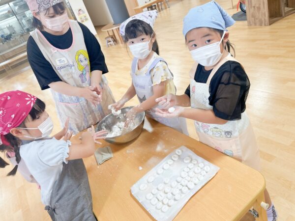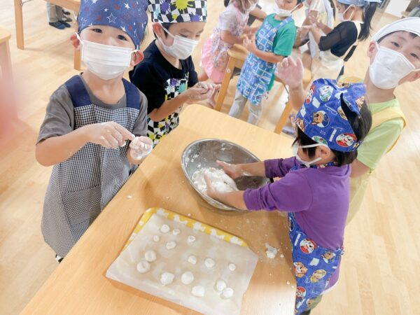 今日のお団子のお味は、みたらしときなこ。 「かたいかな?」「もう少しお水を入れたほうがいいかな?」と話し合いながら、 子どもたちは感触を楽しみ、工夫しながらお団子作りをしていました。 自分たちで作ったお団子を味見すると、 「涙が出るくらいおいし〜!」と、思わず笑顔がこぼれます。 自分の手で作った喜びと、おいしさを分かち合う嬉しさに、心もお腹も満たされた時間となりました。