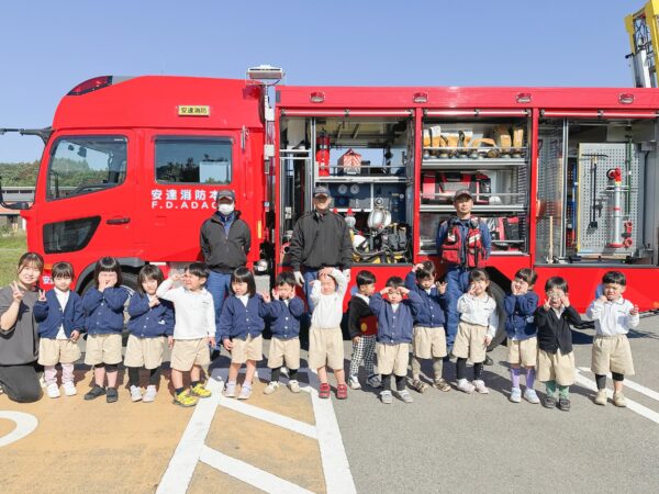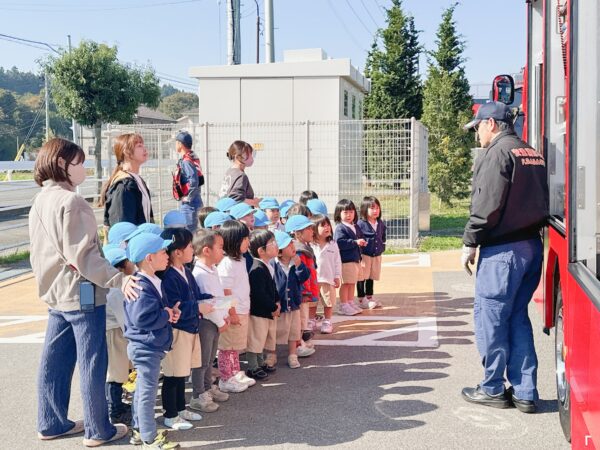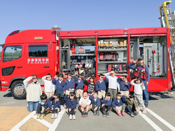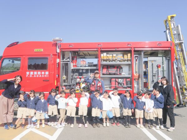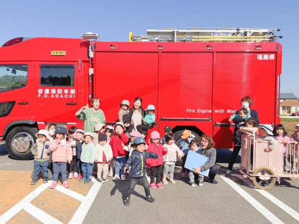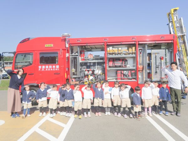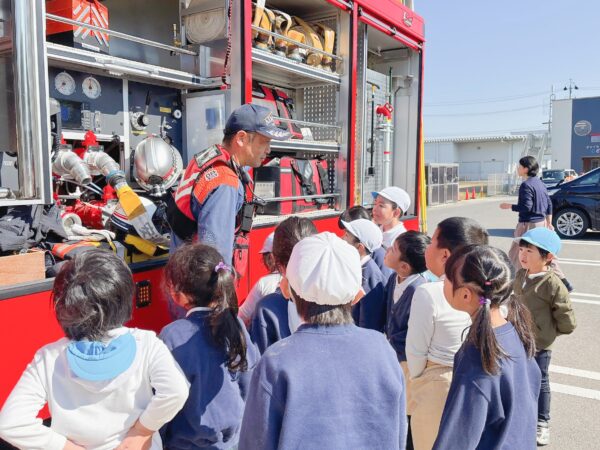 青空の下、太陽に照らされた大きな消防車に子ども達も目を輝かせていました♪