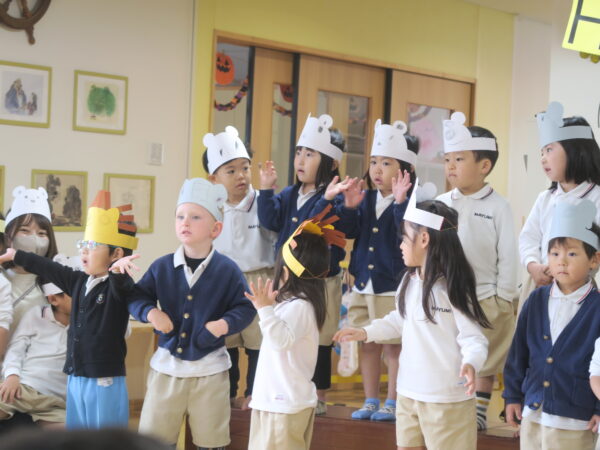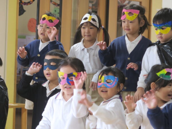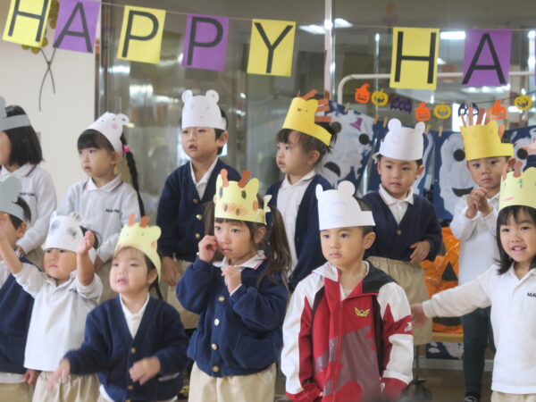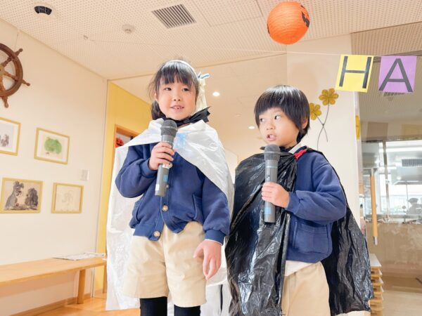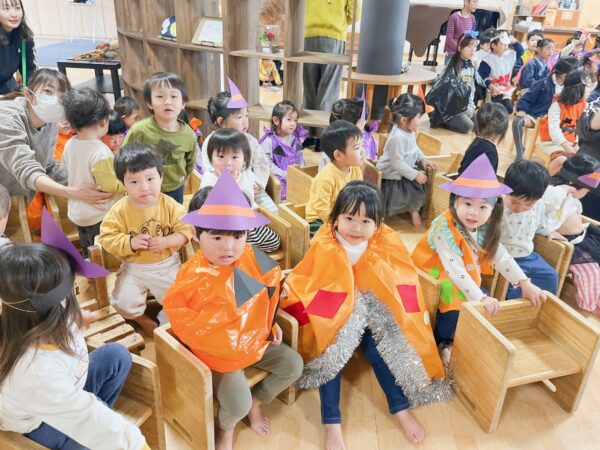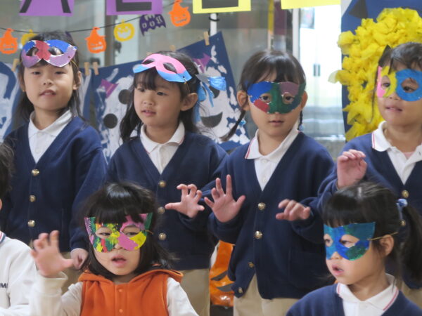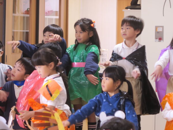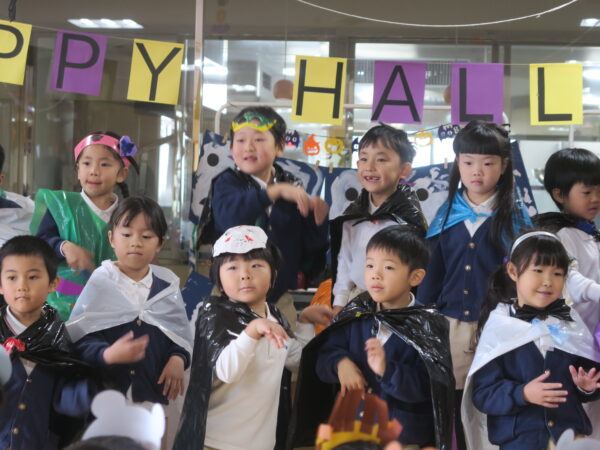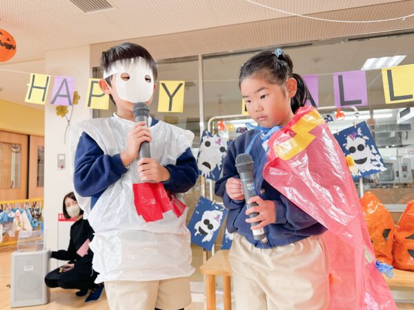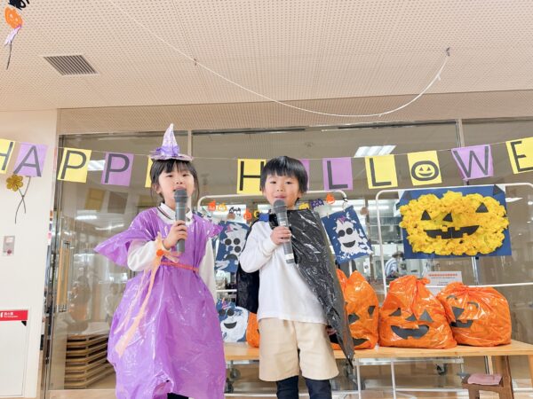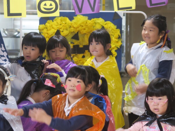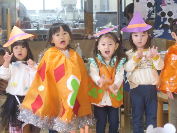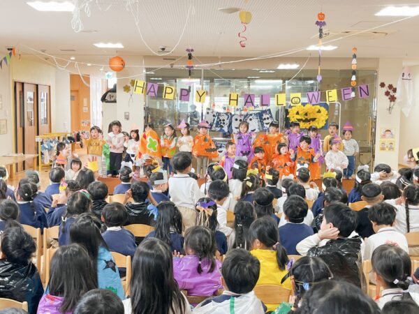 ハロウィンパーティーは、年長さんが用意してくれたクイズや、学年ごとに手遊びやダンスを披露しながら楽しい時間を過ごしました。