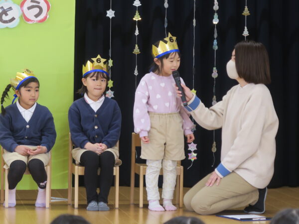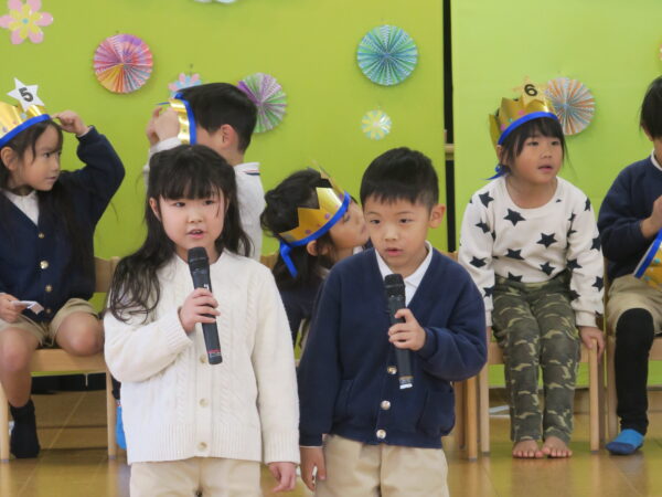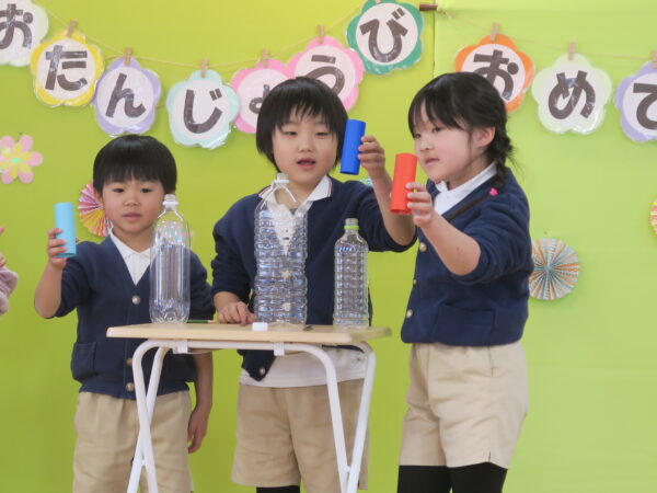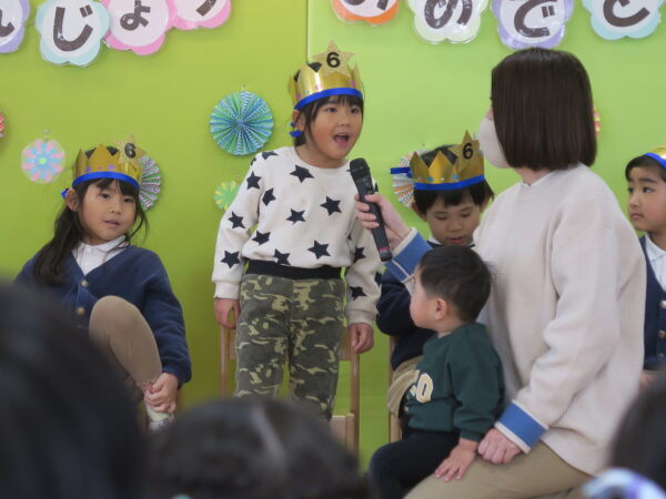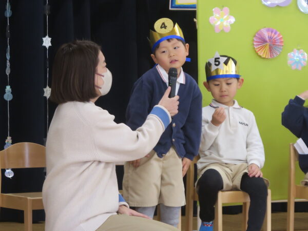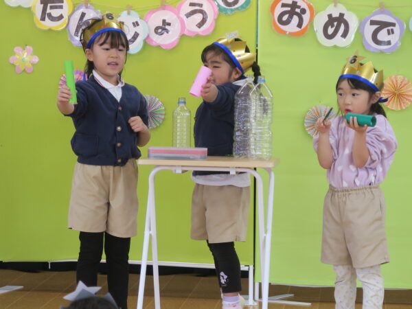 お誕生日おめでとうございます。 みんなの前でドキドキしながらもきちんとインタビューに答えてくれました。 出し物は、年長児の力をかりてマジックを披露しました。 1月うまれのお友達すくすく元気に育って下さい!!