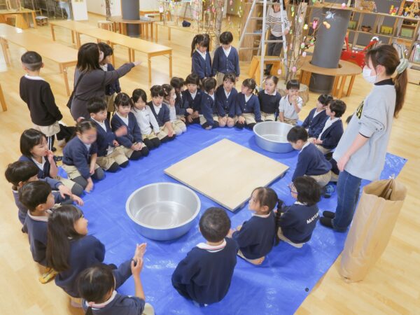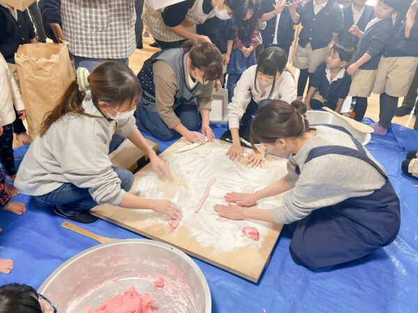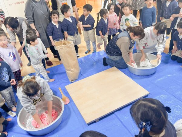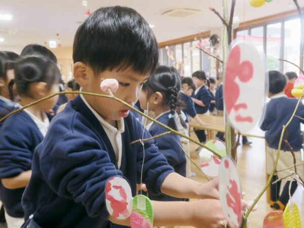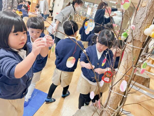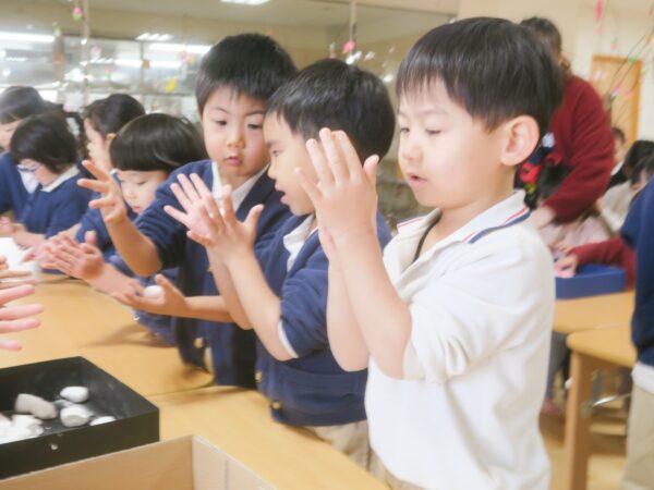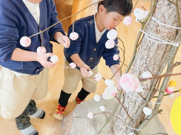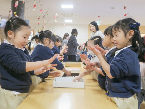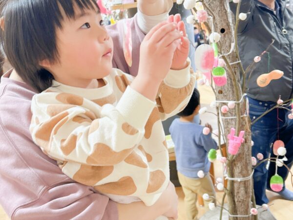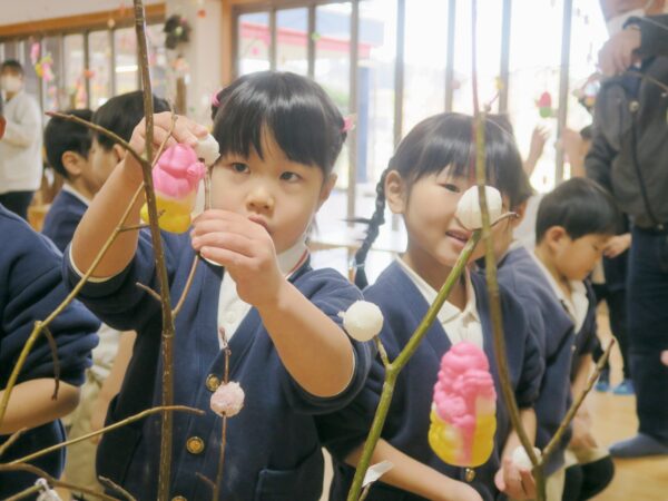 まゆみ学園伝統の行事「だんごさし」 今年で、47回目となりました。 五穀豊穣を記念し、子どもたちのかわいい手で丸められた団子を飾ったみずきの木は、まるでお花が咲いたかのようです。 乳児部の子どもたちも、感触を楽しみながら、伝統の行事に親しみました。 ご協力いただいたお母さん方、おばあちゃん方、ありがとうございました。