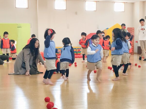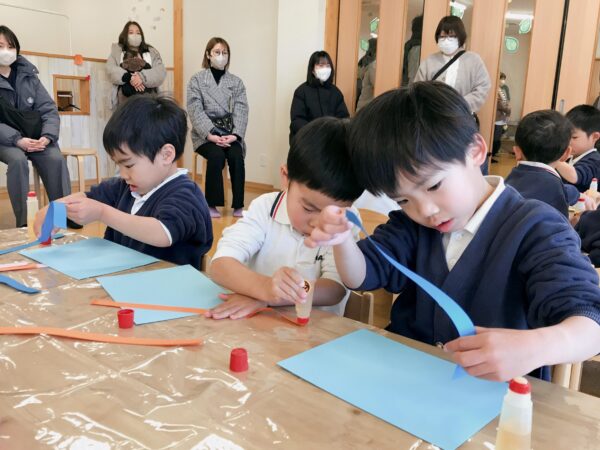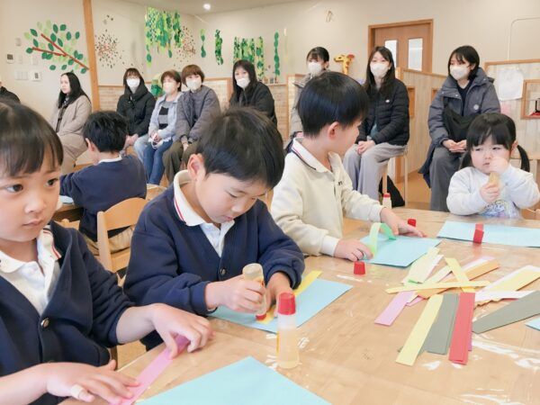 お忙しい中保育参観にご参加頂いた保護者の皆様、ありがとうございました! 「明日は保育参観なんだよ」と期待が大きかった年中児の子ども達。 棒取り玉取りと競い合う姿、色々考えながら制作遊びを進める姿を見て頂きました。