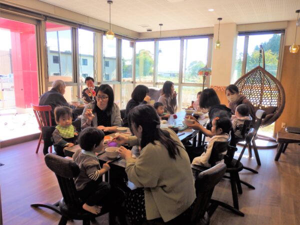 今日の親子制作では、 「りんご」と「なし」と「ぶどう」をかごの中に、貼りました。 かわいい果物のかごのできあがりです。 「まゆみぷらす」は今日が芋煮会の日。 センターに遊びに来たお友達も、 いも煮汁を、ごちそうになりました。
