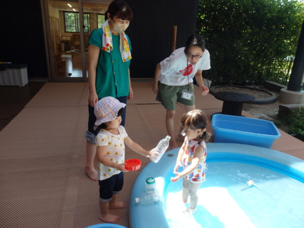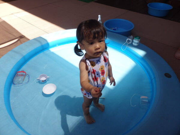 今日の親子制作は『金魚』を作りました。 子どもたちは、ママの手を借りなくても上手にのりを使い金魚を 貼っていました。 制作の後はプールに入り、とても気持ちよさそうに水遊びを楽しんで いました。
