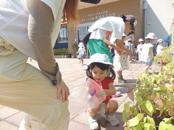 今日のプレスクールは、アサガオを使って色水遊びをしました。 まずは、うさぎ組のお友だちと一緒に戸外でアサガオの花を集め、 水の入った袋の中にアサガオを入れてモミモミ♪ とってもきれいな色が出て、ペットボトルに入れると美味しそうなぶどうジ ュースの出来上がり! お友達同士仲良くなって、一緒におやつを食べてニコニコ。 今日のプレスクールも楽しかったね。