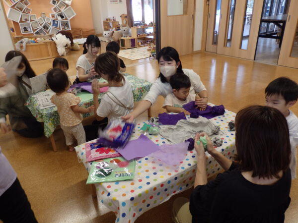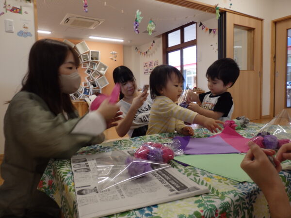 今日の親子制作は、お花紙で『ぶどう作り』をしました。 新聞紙をくしゃくしゃ丸めて好きな色のお花紙で包み 袋に詰めたらステキなぶどうの完成!! ぶどうが並んで支援センターぷらすにも秋が訪れました♪ 次回の親子制作は10月11日(金) 『葉っぱのリース』を作ります。