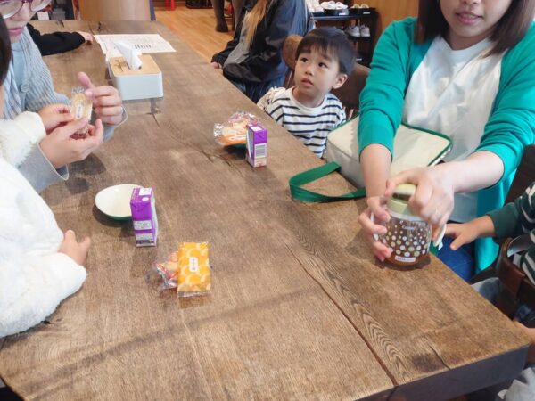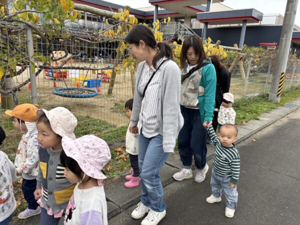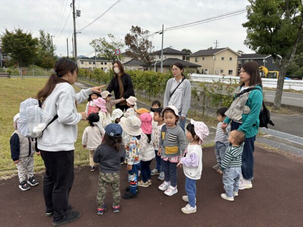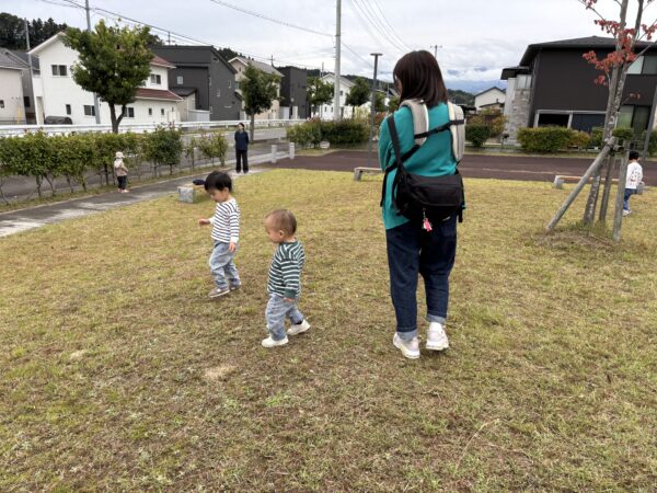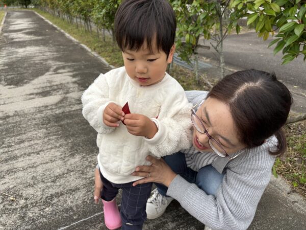 コスモスを見つけたり、色づいた葉っぱを拾ったりしながら