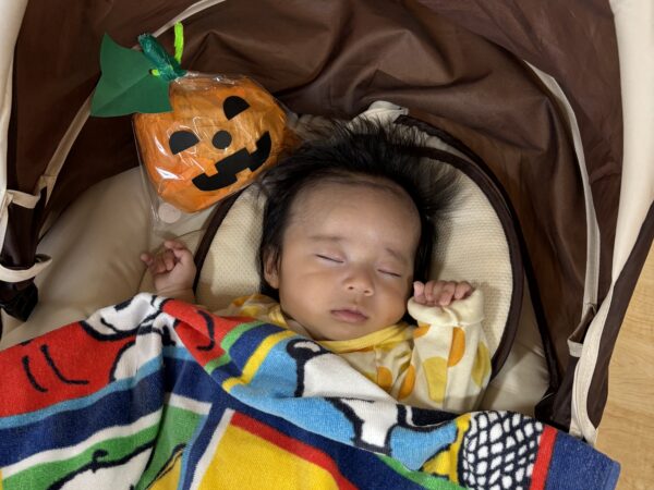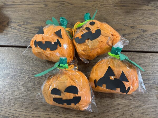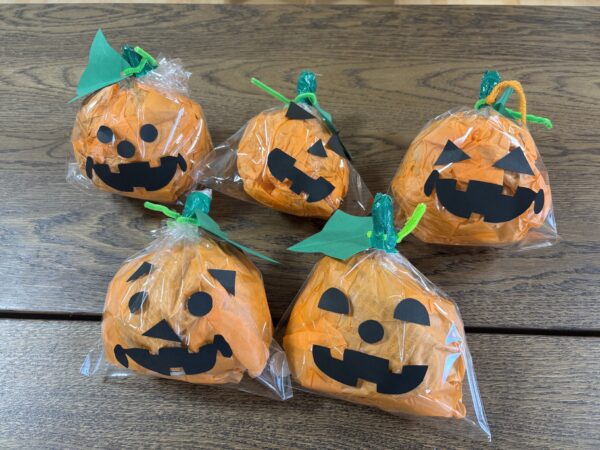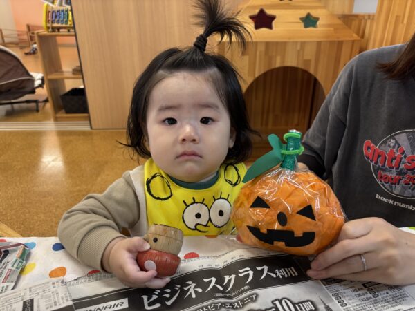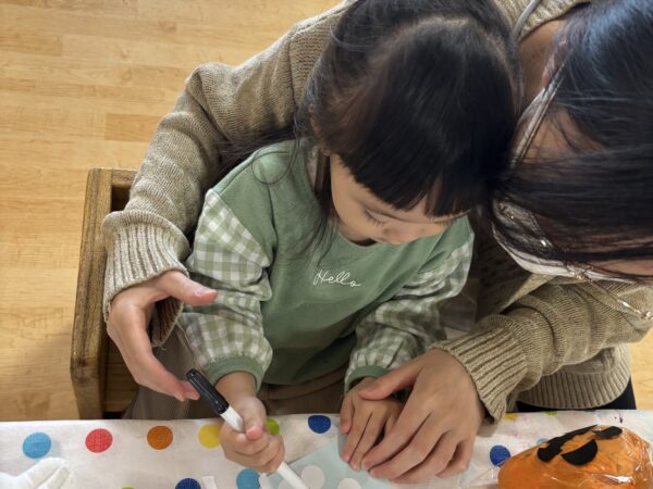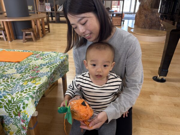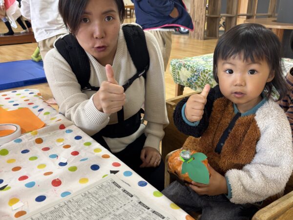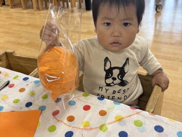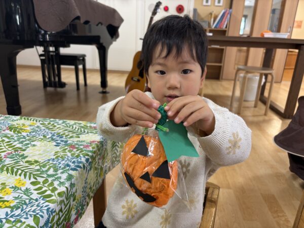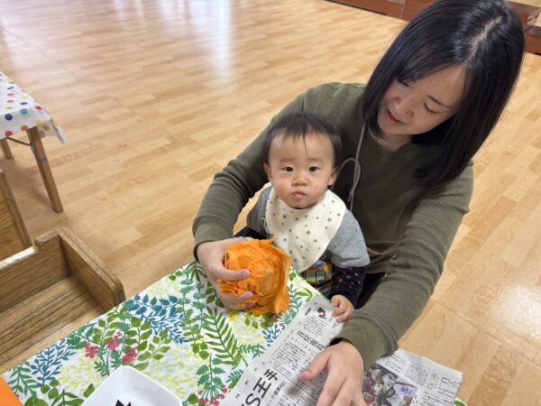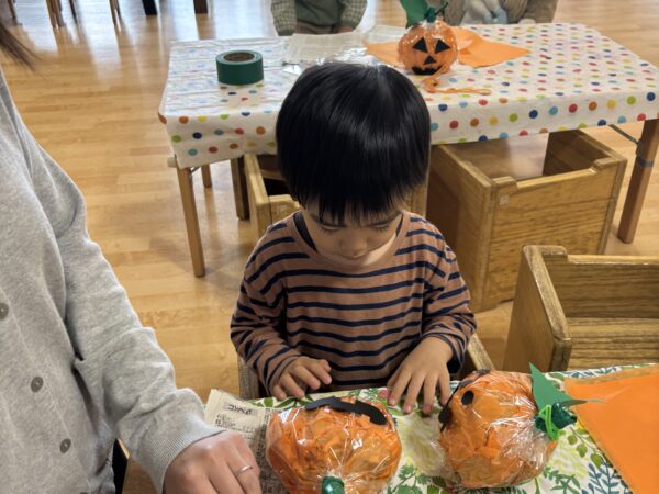 今日は親子でハロウィンランタン作りを楽しみました。 オレンジ色の花紙を丸めて袋につめ、 目や口の画用紙で思い思いの表情をつけると ランタンの完成! ハロウィンが待ち遠しくなりますね。