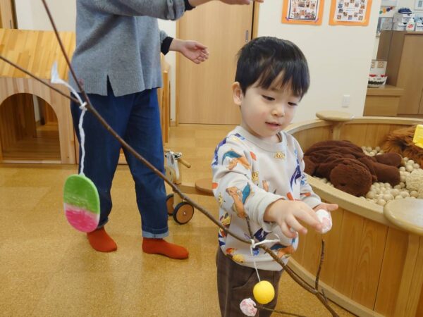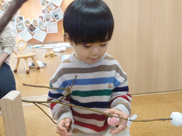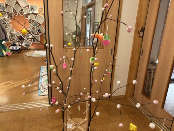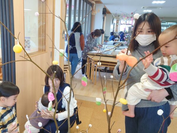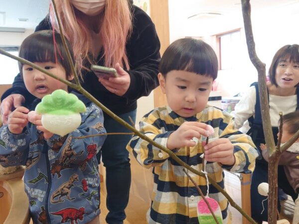 今日はこども園のみんなと『だんごさし』をしました。 五穀豊穣を願い行われる行事です。 参加したお友だちは、センターで 紅白のおだんごを丸め、ゆでただんごを 『みずきの木』にさしました。 まゆみ学園でのだんごさしは、本年で47回目となります。