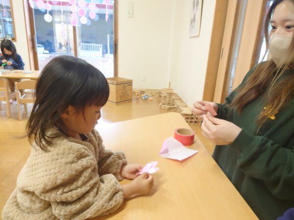 先生に折り紙でハートを作ってもらってニコニコ笑顔です。