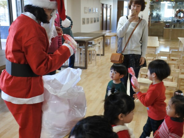 最初は、♪赤鼻のトナカイ♪をみんなで合唱。歌い終わったら、なんと、サンタさんがセンターに来てくれて、子どもたちは大興奮!