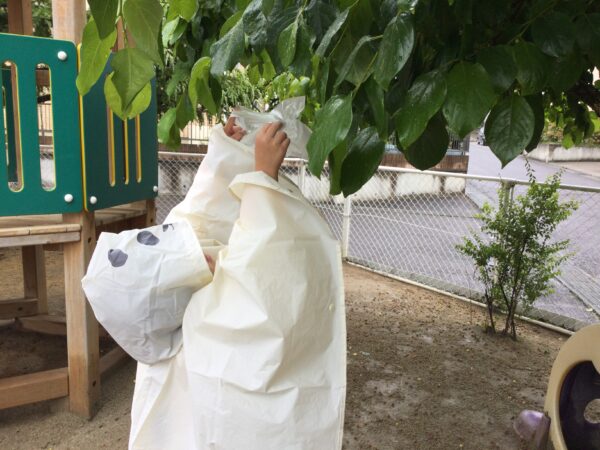 数日雨が降り続け、なかなか園庭で遊べない日が続いています。今日は雨がやんだり、小雨になったりしたことでカッパを着て雨の日探検に行こう!!と意気込む子どもたち♪早速、カッパを着て、長靴を履いてルンルン気分で園庭へ出る姿が見られました。大きな水たまりの上を長靴で踏み、ぴちゃぴちゃと音をたてたり、水しぶきを浴びることを楽しんだり、シートにたまった水溜りや木を揺らし、落ちる葉っぱからの雫を袋で集めたりと無我夢中で雨の日ならではの遊びを満喫できました。カッパ姿の子どもたちがとても可愛かったです♡