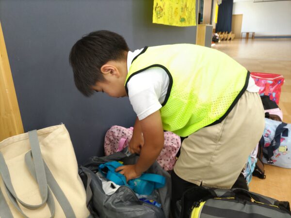 頑張って歩いたフィールドワークの後のお昼ご飯は、とてもおいしいごちそうでした!おにぎりと、給食の先生が作ってくれたとうもろこしときゅうりの漬物も頂きました。おうちの人がたくさんの気持ちを込めて作ってくれたおにぎりは、更に子ども達に元気をくれました。『おいしい!』と繰り返し言葉にしながら美味しさをかみしめ、かき氷も食べた後は夕ご飯の準備です。片付けや荷物の整理も頑張っています!