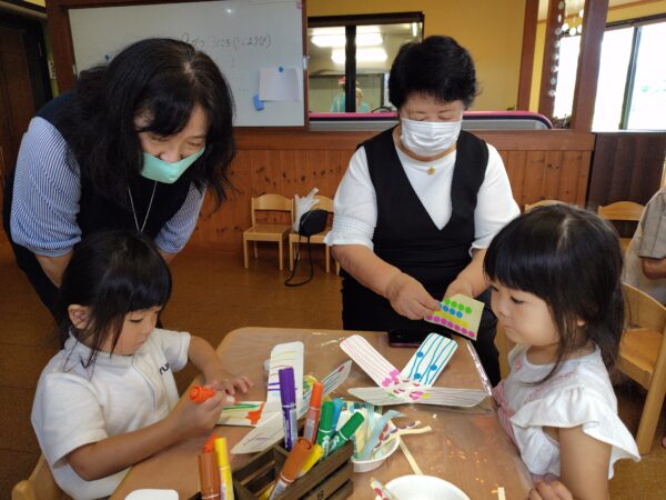 たんぽぽ組の子ども達は、来てくれた嬉しさだけでなく緊張や恥ずかしさもあり少し静かにスタートしましたが、わらべ歌遊びをする様子に「可愛いね。」「すごいなー!」とたくさん拍手をもらいすぐに笑顔になりました。おじいちゃん・おばあちゃんとの『なべなべそこぬけ』や『かごめかごめ』も手を繋いでいるだけで楽しく、ぎゅっと握る手がとても可愛かったです。『牛乳パックのこま作り』では、もくもくとシールを貼ったりペンで色を付けたりする真剣な子ども達が見られました。くるくると回すことに成功するとたくさんの歓声をいただき、大喜びで何度も何度も見せていました。