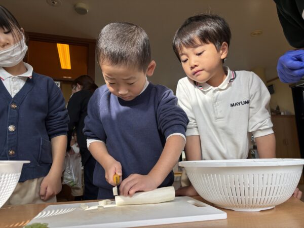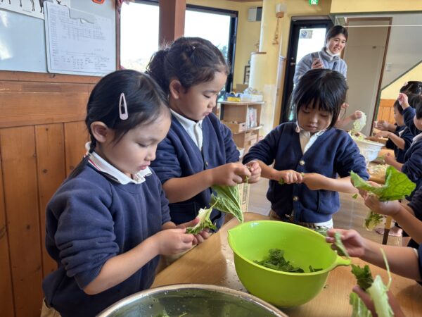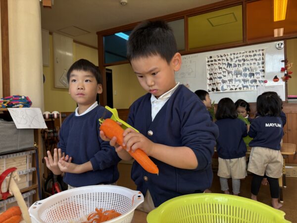 先日収穫した野菜とやさい畑さんから購入した野菜を幼児部の子ども達がちぎったり、包丁を使って切ったりして芋煮を作りました。