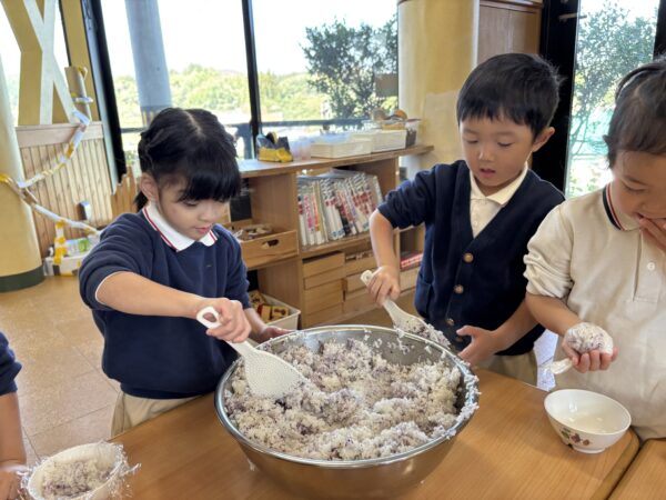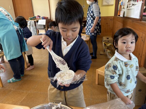 幼児部の子どもたちは自分の分のおにぎりもにぎにぎ…