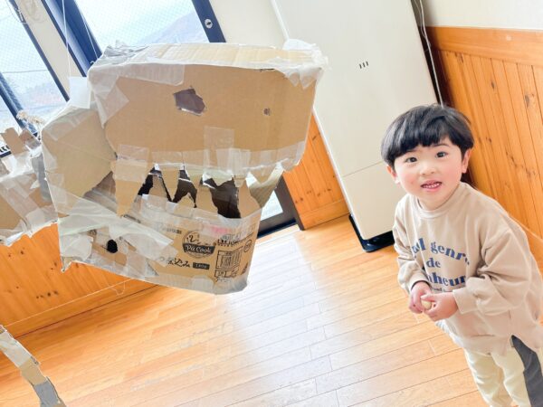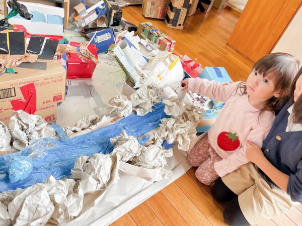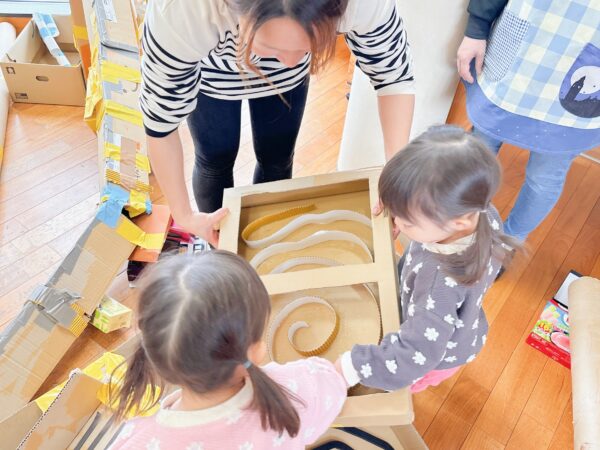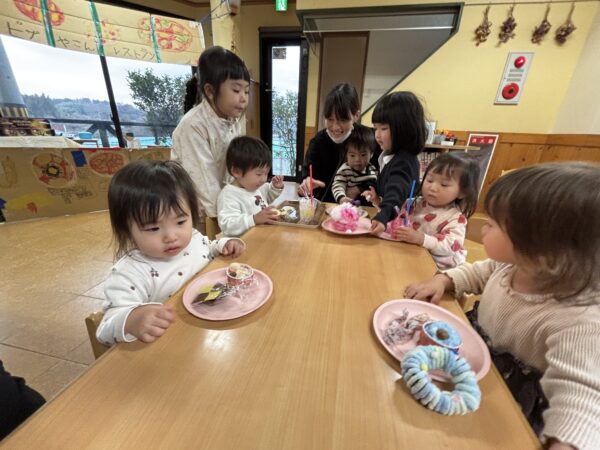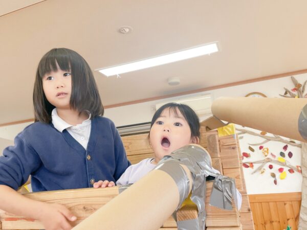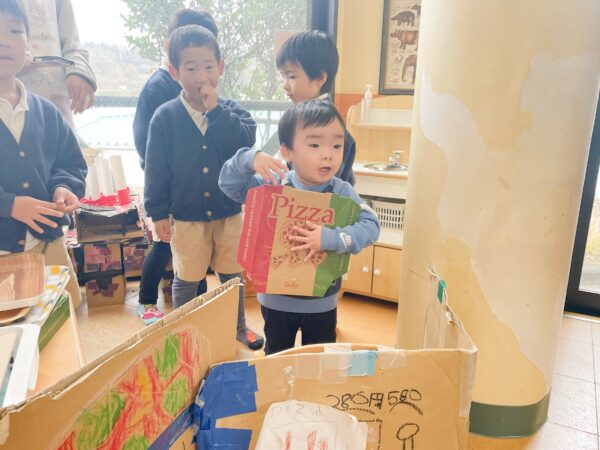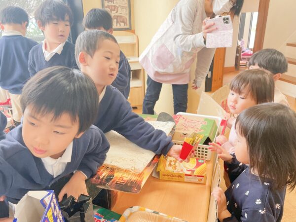 乳児部のみんなで、幼児部のお兄さんお姉さんが作った街・ボール転がしのコース・お店屋さんに遊びに行きました。 幼児部の子ども達は張り切ってご案内!! 「すごいね!!」「かっこいいね!」と目をキラキラさせながら作品を見たり、色々なコースでボールを何度も転がしたり、 お店屋さんで買い物をして「おいしいね」と食べる真似をしたり、お兄さんたちの真似をして一緒にお店屋さんになりきったり… また幼児部への憧れの気持ちが大きくなった乳児部の子ども達でした!!